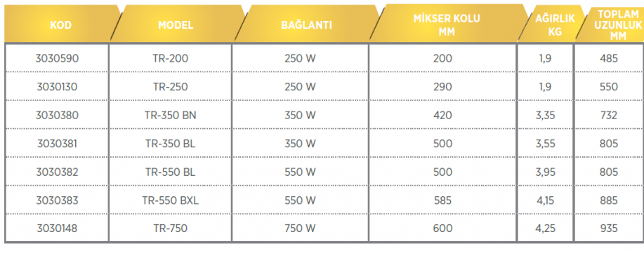 – Püre, çorbalar, kremalar ve soslar için uygun mikser kolu